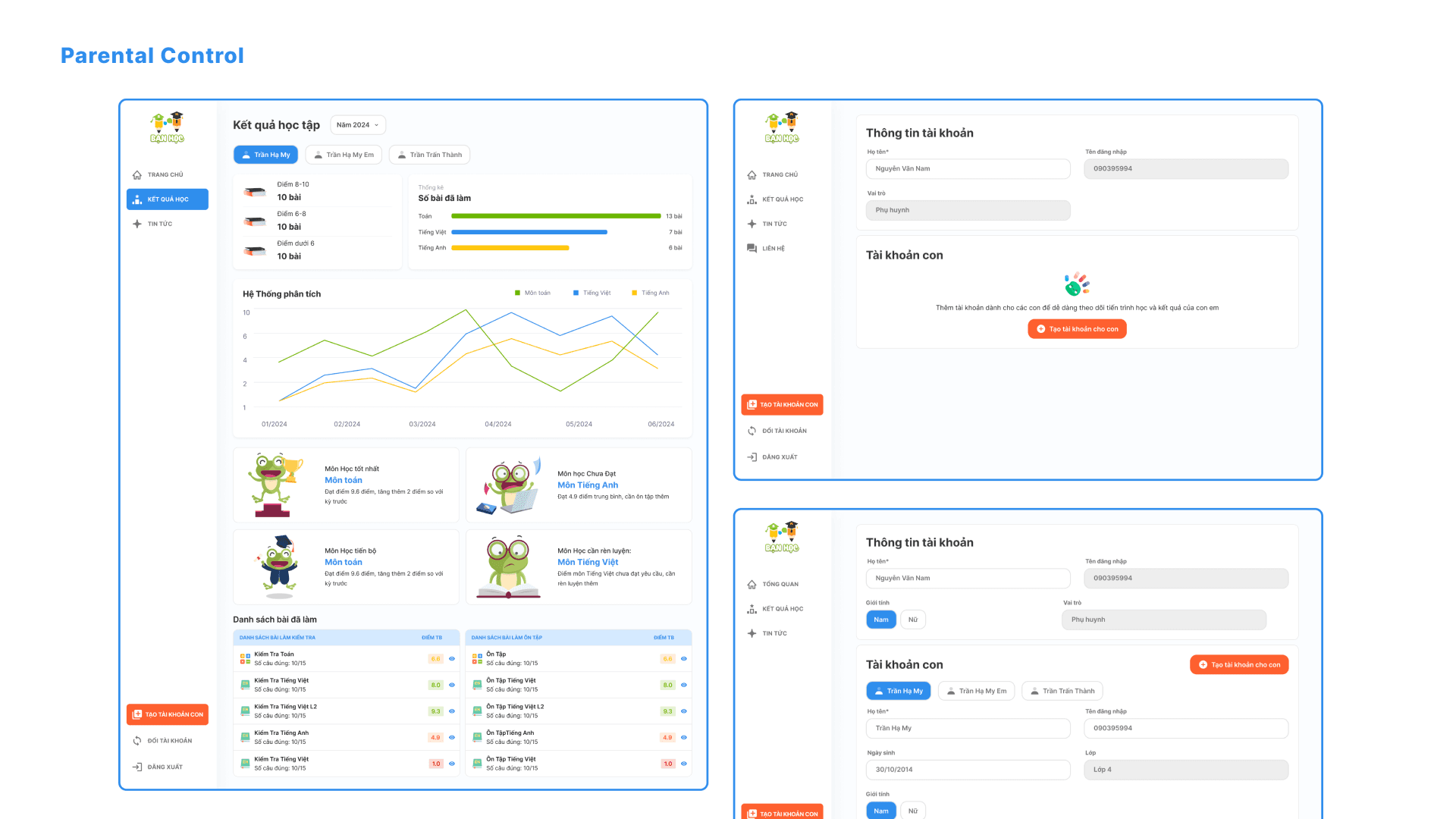 The platform features dashboards showing course progress, quiz results, learning time, and performance insights—helping learners and parents easily track academic development.